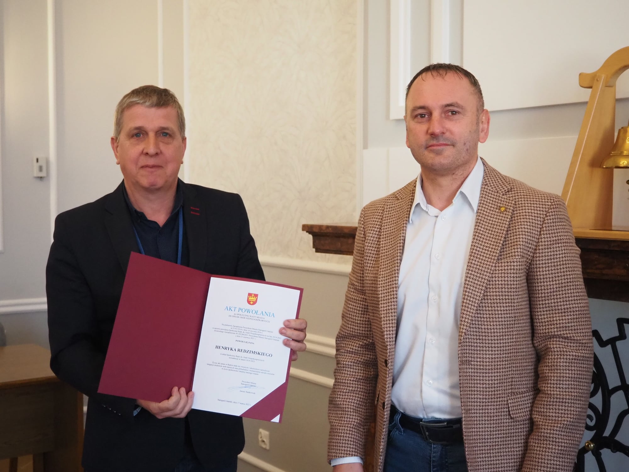 Z rąk Zastępcy Prezydenta Miasta Starogard Gdański ds. Społecznych Macieja Kalinowskiego akt powołania na członka Społecznej Rady ds. Osób Niepełnosprawnych odebrał Henryk Redzimski z Wydziału Techniczno-Inwestycyjnego Urzędu Miasta (z lewej).